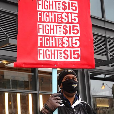 The new US president's plan to introduce a $15 minimum wage has sparked debate. Manuela Saragosa speaks to Allynn Umel, campaign director at the Fight for $15 campaign, about why a federal rise in wages is overdue. Jacob Vigdor, professor of public policy and governance at the University of Washington in Seattle, discusses the pros and cons of a wage hike during a pandemic with Jack Kelly, founder of recruitment firm WeCruitr. (Photo: Demonstrators participate in a protest calling for a $15 minimum wage outside of McDonald's corporate headquarters on January 15, 2021 in Chicago, Illinois. Credit: Getty Images)