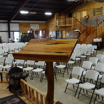 Bandera, Texas, is the self-proclaimed Cowboy Capital of the World. It is also home to Ridin' The River Cowboy Fellowship, a cowboy church established eight years ago with a mission to connect cowboys to Christ. Resembling a giant barn with concrete floors, the church has corrugated walls, and a modest cedar-wood stage for sermons. Non-denominational, everyone is welcome at their Sunday services, Wednesday night Bible studies, plus regular roping and barrel racing events at the adjacent arena. Pastors Jeremy Levy and Jeff Bishop invite us to join their 500-strong congregation for the monthly “Chuckwagon breakfast” to find out why the cowboy way of life is inherently Christian. Here we meet professional working cowboys - ranchers, cowpokes, herders, professional rodeo riders - and fans of cowboy culture, who are drawn to this come-as-you-are style of worship. We also go behind the scenes at a local rodeo with church member Robin Montague as she competes in the barrel racing. Ridin' The River Cowboy Fellowship is a member of the American Federation of Cowboy Churches, a non-profit based in Waxahachie, Texas, which represents over 200 partner churches across 16 states. Cowboy churches have flourished in the last 15 years, despite a national decline in church membership, with more than 500 in the USA, and outposts in Mexico, Canada, Sweden, the Philippines, and Australia. Presenter: Robin Montague and Jeremy Levy Producer: Victoria Ferran (Photo: Interior of the Ridin' The River Cowboy Fellowship church taken from the stage. Credit: Victoria Ferran/BBC)