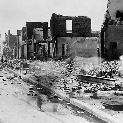 Greenwood was an African American success story: a thriving, wealthy district of Tulsa. Over the course of two days at the end of May 1921 it was the scene of looting, rioting and murder. After 18 hours the area was razed to the ground by vigilantes. One eye witness said it looked like the world was coming to an end with bullets. Nobody to this day has been able to establish the true number of deaths. Some put the figure in the hundreds, with casualties on both sides. The community rebuilt itself however, and today it’s the focus of a multi-million dollar investment and education programme. Joining Rajan Datar to examine the events of 1921 are Carol Anderson, the Charles Howard Candler Professor of African American Studies at Emory University and the author of White Rage; Hannibal B Johnson, lawyer and author of numerous books on the city’s history including the forthcoming Black Wall Street 100: An American City Grapples With Its Historical Racial Trauma and John W Franklin, cultural historian and former senior manager at the Smithsonian National Museum for African American History and Culture in Washington DC. He’s also the grandson of Buck Colbert Franklin, a lawyer and leading community figure who survived the massacre. There is language in the programme which reflects the historical records and accounts recorded at the time of the events in Tulsa, which some listeners may find offensive. (Image: The aftermath of the Tulsa Race Massacre at east corner of Greenwood Avenue and East Archer Street. Credit: Bettmann Archive/Getty Images)