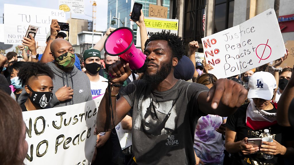 Why is George Floyd the latest in a long line of unarmed black men killed by US police? Studies show black men are three times more likely to be killed by police in America than white people. With Helena Merriman. (A man speaks into a bullhorn as demonstrators march in Los Angeles, California. 2 June 2020. Brent Stirton/Getty Images)