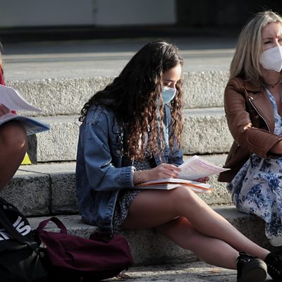 As new students start at universities in many countries around the world, governments are grappling with how to contain a second wave of Coronavirus. Already many universities have put lectures online and students are being told to stay in their rooms. But is this fair? Covid-19 is a deadly virus but not so much for the young. Can or should we keep the world locked down until there’s a vaccine or cure? Or, Tanya Beckett asks: should we learn to live with Covid? (Students wait to start their entrance exams outside the University of Madrid, Spain. Credit: Eduardo Parra/Getty Images)