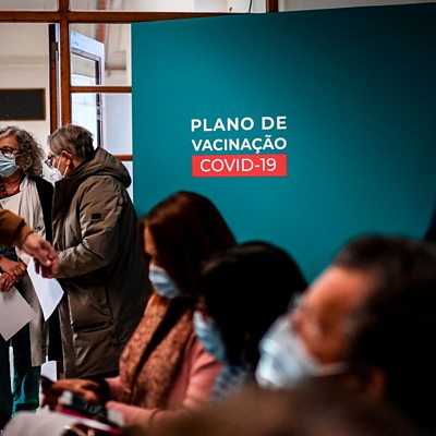 On June the 12th of last year the 27 health ministers of the European union signed off on a plan to buy vaccines on behalf of all the EU’s member countries. The aim was to secure enough doses to immunise all of its 450 million citizens. But the delivery and vaccination programme has lagged far behind countries like the UK and US. Tanya Beckett finds out why. (Waiting to be vaccinated at Santa Maria Hospital in Lisbon, Portugal. Photo: Patricia de Melo Moreiro /Getty Images)