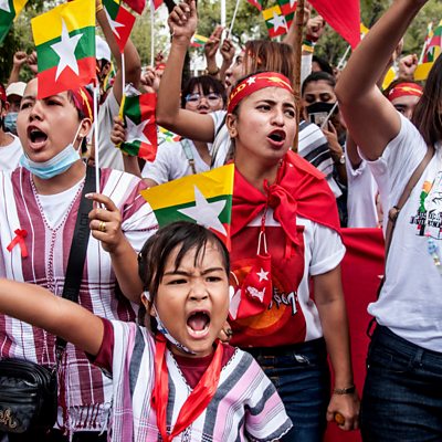 As protests continue in Myanmar against the generals who staged a military coup, and with Aung San Su Kyi under house arrest and facing criminal charges, has the country lost all prospects for a democratic future? With Tanya Beckett. (A little girl shouts slogans with protestors waving flags of Myanmar, 22 February 2021. Credit: Peerapon Boonyakiat /Getty Images)