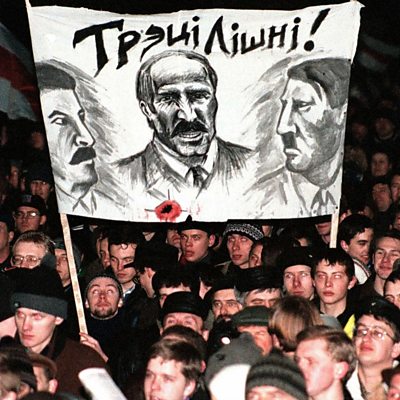 For more than 20 years, people in Belarus have been protesting against the authoritarian rule of President Alexander Lukashenko - who's been dubbed Europe's last dictator. Lukashenko came to power in a landslide election victory in 1994 but he soon changed the constitution to give himself sweeping new powers. He has remained in office ever since, winning elections which observers say are rigged. Opponents of the regime have faced harassment, violence and arrest. Some are believed to have been kidnapped and murdered by the state. Alex Last has been speaking to the exiled dissident and co-founder of the Belarus Free Theatre, Nikolai Khalezin, about the origins of the protest movement in Belarus. Photo: A banner compares Belarusian President Alexander Lukashenko to Stalin and Hitler, during a protest march in Minsk, Belarus, March 15, 2000 (Getty Images)