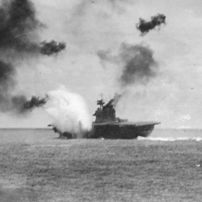 On 4th June 1942, aircraft carriers of the Japanese and American fleets fought a huge naval battle near Midway Atoll in the Pacific. The outcome marked a turning point in the war. Using archive recordings we hear from American and Japanese airmen who flew in combat that day. Photo: (Original Caption) This official United States Navy photo shows the American aircraft carrier Yorktown, already listing badly to port, as she received a direct hit from a Japanese bomber in the Battle of Midway Island, June 4th 1942. The black puffs in the photo are exploding U.S. antiaircraft shells. (Getty Images)