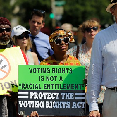 The Voting Rights Act of 1965, a landmark civil rights-era electoral law was designed to protect African-American and other minority voters. It was introduced to remove the many obstacles that were in place to prevent African-Americans from being able to vote. Many states, particularly in the south, used intimidation, local laws and so-called literacy tests to prevent black people from being able to register to vote. In 2010 Shelby County in Alabama attempted to overturn a key part of the law. In 2013 the US Supreme Court upheld their challenge. Now voters who are discriminated against bear the burden of proving they are disenfranchised. Farhana Haider hears from civil rights attorney Kristen Clarke who fought to protect the Voting Rights Act. Photo Washington DC June 25. Supporters of the Voting Rights Act outside the U.S. Supreme Court. Credit Getty Images