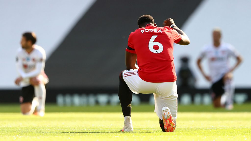 Sparta Prague's Costa Nhamoinesu describes the racist incidents in Czech football in reaction to the Black Lives Matters movement. The former Australia international Alicia Ferguson reacts to the announcement that Australia and New Zealand will host the 2023 women's World Cup. And the owner of Mexican club Santos Laguna, Alejandro Irarragorri, tells us how Covid-19 has affected his club and his country. (Picture: Paul Pogba of Manchester United takes a knee in support of the Black Lives Matter movement by Michael Steele/Getty Images)