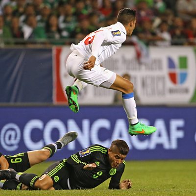 Cuban footballer Jorge Corrales discusses an historic moment for the national team, for the first time foreign-based footballers can now play for Cuba. And the Wolfsburg defender Kevin Mbabu talks about their impressive season so far. Picture: Jorge Corrales of Cuba leaps over two Mexican players during a match in the 2015 CONCACAF Gold Cup (Jonathan Daniel/Getty Images).