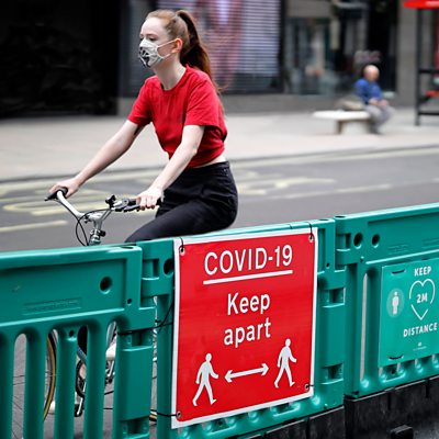 What difference does a metre make? The World Health Organisation recommends that people keep at least 1 metre apart from each other to stop the spread of Covid-19, but different countries have adopted different standards. The US Centers for Disease Control and Prevention recommends staying six feet apart - that’s just short of 2 metres; in the UK, the rule is 2 metres. But all this has a big impact on the way businesses and societies get back to work. Tim Harford investigates the economic costs and conundrums of keeping our distance in a post-lockdown world. How can we avoid infection spreading again, while getting on with life? Producer: Ruth Alexander (A cyclist rides along Oxford Street in London where barriers have been installed to widen the pavement to enable social distancing due to COVID-19, June 2020. Credit: Tolga Akmen/Getty images)