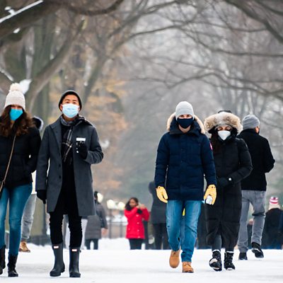 Cases of Covid 19 began to soar in the US in the autumn. By early January there were around 300,000 new cases a day. But since then the numbers have fallen steeply. What caused this dramatic drop? From herd immunity to the weather, Tim Harford explores some of the theories with Derek Thompson of The Atlantic magazine and Professor Jennifer Dowd, deputy director of the Lever Hume Centre for Demographic Science at the University of Oxford. (People with face masks walk through The Mall in Central Park, New York City. Credit: Noam Galai /Getty Images)