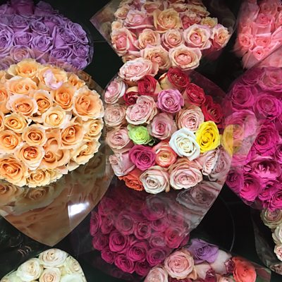 Most flowers sold in the florists and supermarkets of Europe are grown in East Africa, where the warm climate supports roses and other plants to grow year round. But is it sustainable? Vivienne Nunis follows the international supply chain from a Kenyan flower farm to the hub of the global flower trade near Amsterdam, where every morning stems are sold at auction before being transported in cold storage trucks to buyers across Europe. The Dutch have been trading flowers since medieval times, when speculators paid enormous prices for tulip bulbs. We pay a visit to Amsterdam's Tulip Museum to find out why. The worldwide flower market is worth $40bn a year, but as growing numbers of consumers start to question the true environmental cost of what they buy, some growers are advocating for a return to seasonal, local blooms. We visit English grower Tess Wardman of Iris and Wilf flowers. Producer: Sarah Treanor. Image: Bouquets of roses for sale. Credit: BBC