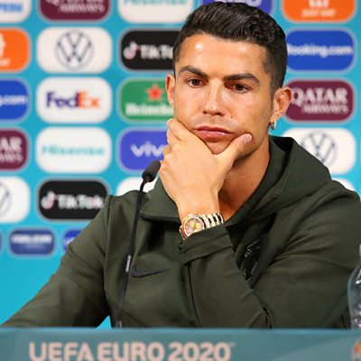 Footballers and other athletes are standing up to the sponsors who subsidise them. Ed Butler speaks to Laurence Halsted, a former British Olympic Fencer who wrote about his concerns about the Games in Rio de Janeiro, in 2016. Sports marketing consultant Tim Crow says the involvement of people's politics in sport makes the usual bonanza for sponsors at events a lot more problematic. Martyn Ziegler, chief sports reporter at The Times, thinks the Olympics may find itself under growing pressure as players blur the messages that brands and governments are hoping to promote. Produced by Benjie Guy. (Picture: Portuguese footballer Cristiano Ronaldo at a Euro 2020 press conference. Credit: Getty Images.)