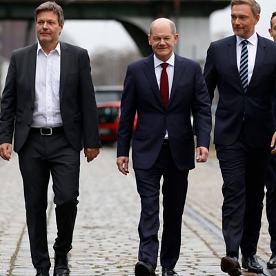 Can the ambitious renewable energy plans of the incoming government overcome domestic nimbyism and Russian gas politics? Ed Butler hears from one member of the new left-liberal-green coalition, Social Democrat MP Jens Zimmermann, about their plans to phase out coal entirely by 2030, and replace 80% of electricity generation with wind and solar. But building new wind turbines already faces substantial red tape and vociferous opposition from bird conservation groups, as industry man Steffen Lackmann explains. Meanwhile, how will the government tackle a more pressing matter - Russian President Vladimir Putin's alleged restriction of gas supplies to Europe this winter in order to force German approval for the new Nord Stream 2 pipeline. Ed speaks to Gustav Gressel, geopolitical analyst at the ECFR think tank, and to Melissa Eddy at the New York Times' Berlin bureau. Plus Yuri Vitrenko, head of Ukraine's gas pipeline company Naftogaz, explains why he fears approval of the pipeline could mean war in his country. (Picture: Leaders of the incoming German government, including Chancellor-elect Olaf Scholz (centre), inadvertently re-enact the opening scene from Reservoir Dogs; Credit: Odd Andersen/AFP via Getty Images)