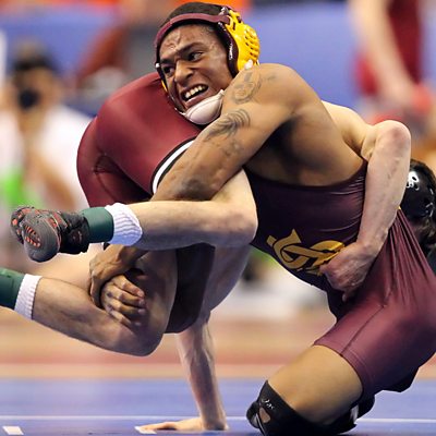 In March 2011, Anthony Robles won a national college wrestling title in the United States despite being born with only one leg. Relying on upper-body strength and a unique sense of balance, Robles went undefeated throughout the entire season and was voted the outstanding wrestler of the NCAA finals. He also holds the world record for the most pull-ups in one minute. Anthony Robles talks to Ian Williams. PHOTO: Anthony Robles in action at the 2011 finals (Getty Images)