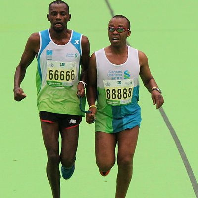 In 1995, promising Kenyan runner Henry Wanyoike suffered a stroke and lost his sight. After initially feeling depressed, Henry learnt how to run tethered to a guide and went on to a set a series of long-distance running records for the blind. Henry Wanyoike talks to Alex Last. (Photo: Henry Wanyoike, right, with his guide on a run in 2013. Credit: Getty Images)
