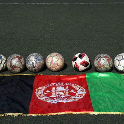 Afghan footballer Fati talks about her escape from the Taliban and her return to football. Exiled Afghanistan players have reunited in Australia and are back training together for the first time since the Taliban took control of the country last year. Picture on website: Afganistan Flag beside the soccer balls laid out on a football pitch ( Maryam Majd ATPImages/Getty Images).