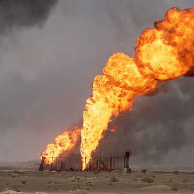 After the end of the Gulf War in 1991, retreating Iraqi forces set light to oil wells in the desert. Specialist firefighters were drafted in by the Kuwaiti government to help put them out. Simon Watts spoke to one of those firefighters, Richard Hatteberg, in 2010. This is a rebroadcast. Photo: an oil fire in Kuwait. March 1991. Credit:Getty Images.