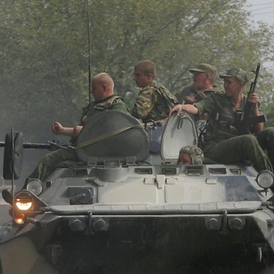 In August 2008, Russia went to war with another former Soviet republic, Georgia. The conflict began after Georgia attempted to recapture the breakaway region of South Ossetia, which had fought a separatist war with Tbilisi during the 1990s. As fighting escalated, Russia sent in troops - seizing control of South Ossetia and also of Georgia's other breakaway region, Abkhazia. The five-day war ended in humiliation for Georgia - several towns, a Black Sea port and military airfields were bombed by the Russian air force. Several hundred people were killed and thousands of ethnic Georgians displaced. Nick Holland reports. PHOTO: Russian troops on their way to South Ossetia in 2008 (Getty Images)