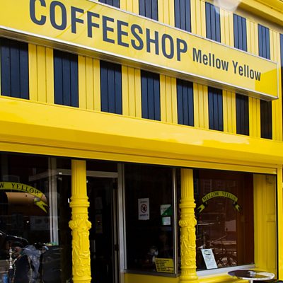 How Amsterdam became the home of cannabis coffee shops .The Mellow Yellow Café set a pattern in 1973 of attracting customers, which hundreds of others would follow. Although selling and smoking the drug was illegal, possession of small quantities of cannabis was tolerated by the Dutch police. Bob Howard talks to the café’s owner, Werner Bruining. Photo: Mellow Yellow Cafe, Amsterdam, Netherlands. Credit: Alamy