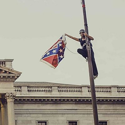 In June 2015 an American anti-racist activist climbed a flagpole on the South Carolina state house grounds to take down the Confederate flag. The protest followed the killing of 9 black people at a historic Charleston church by a white supremacist who was pictured holding the flag. The Confederate flag was the battle flag of the troops who fought to retain slavery during America’s civil war. For African Americans the flag is a symbol of slavery, segregation and black subordination. Bree Newsome Bass talks to Farhana Haider about her act of protest. Bree Newsome taking down the Confederate flag at the State House in Columbia, SC, on Saturday 27th June 2015 . She was arrested for her action. (Photo by Adam Anderson / Reuters)