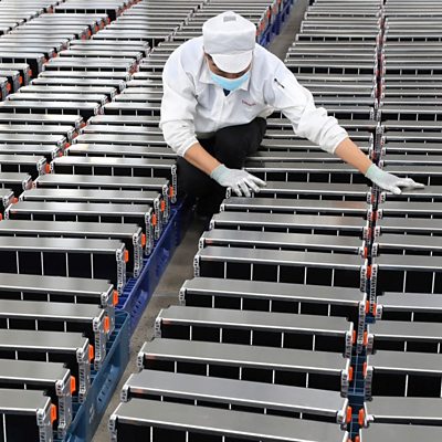 Can we meet the soaring demand for lithium, a vital metal for electric cars and green energy? Mining is concentrated in a limited number of countries such as Australia and Chile. And with China dominating the manufacture of electric car batteries and already accounting for the importation of a high proportion of raw lithium, it may be difficult for Western countries to secure their own supplies. With Tanya Beckett. Producer Bob Howard (A worker checks lithium car batteries at the Xinwangda factory in Nanjing,China on March 12, 2021. AFP via Getty Images)