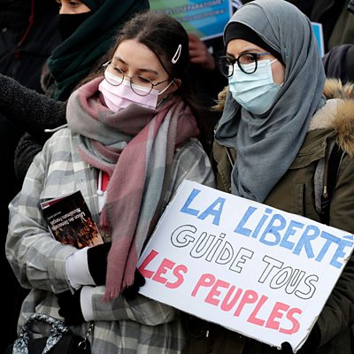 France is on its way to passing The Bill Comforting the Respect of Republican Principles, one of the most controversial laws of President Macron’s presidency. It aims to fight back against what Emmanuel Macron and his ministers are calling “Islamist separatism”, what he says is an assault by Islamist extremists on the values of the French Republic. John Laurenson meets people on both sides of this fractious debate. He visits a closed-down Paris school that its head teacher says is an early victim of President Macron’s war against “Islamist separatism” and meets another teacher – also Muslim - who describes her struggle with what she says is religious extremism in the classroom. John meets an MP and the head of a militant secularist organisation both keen on the law. He also goes to Trappes, a suburb of Paris that many say is a breeding ground for Islamic extremism, and drinks mint tea with a scholar of Islam. He meets an Islamic bookseller called John, goes to the mosque and talks to the mayor, eats a “halal ham” sandwich, meets an inhabitant who says she lives “Islamist separatism” every day and another who says the new law stigmatises Muslims in general and will separate them still further from the non-Muslim people of France. (Photo: A woman holds a placard reading "Freedom leads all the people" as protesters demonstrate against a bill dubbed as "anti-separatism", in Paris. Credit: Geoffroy Van Der Hasselt/AFP/Getty Images)