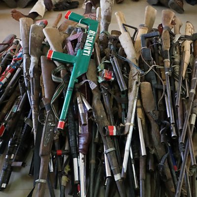 In the last few years, powerful criminal gangs have terrorised a swathe of north west and central Nigeria. From camps in the forest, gangs of bandits on motorbikes have attacked villages killing and kidnapping men, women and children. So how can Nigeria's new leader restore security? What does it say about the future of security in Africa's most populous nation? Alex Last has been to the north western city of Katsina to meet some of those battling the bandits. Photo: Some of the weapons used by vigilantes in Zamfara state, north west Nigeria, 2019 (Photo by Kola Sulaimon / AFP via Getty Images) Reporter: Alex Last Producer: Abdullahi Kaura Abubakar Sound mix: Rod Farquhar Series Editor: Penny Murphy Production assistant: Helena Warwick-Cross