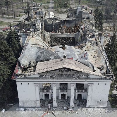 Six months since the start of Russia’s invasion of Ukraine, Stephen Sackur looks back at his interviews with the key players. President Putin gambled he could get away with his aggression. Was he right? (Photo: Aerial view of the theatre building destroyed in the course of Ukraine-Russia conflict in the southern port city of Mariupol, Ukraine,10 April, 2022. Credit: Pavel Klimov/Reuters)