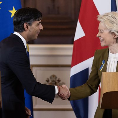 A new Brexit deal for Northern Ireland has been announced. The Windsor Framework replaces the Northern Ireland Protocol - that was deemed unworkable, but does this new deal solve Northern Ireland's trading arrangements? In his speech in Windsor, Prime Minister Rishi Sunak said his new framework agreement had "removed any sense of a border in the Irish Sea". It is true that Northern Ireland consumers should certainly have no sense of a border when it comes to buying food, plants and medicines or taking their dog on the ferry to Scotland. But it will still be a trade border of sorts. Moving goods from Great Britain to Northern Ireland remains conditional: it will require signing up to trusted trader schemes, providing information on what goods are moving and having the correct labelling. But given the constraints the UK set itself back in 2017 - a hard Brexit with no land border on the island of Ireland - that may be as good as it gets. Rishi Sunak and EU chief, Ursula von der Leyen, seemed comfortable together in Windsor but it’s still unclear whether the Democratic Unionist Party in Northern Ireland will back the agreement and bring back the power-sharing government. So, is the Windsor Framework a feasible solution? How did Mr Sunak make such progress where his predecessors failed to? If the DUP do reject it, does this mean Brexit can never truly be ‘done’? And what would be the implications for Northern Ireland, Great Britain and the EU if the wrangling over the border continues indefinitely? Chris Morris is joined by: Raoul Ruparel, special advisor on Europe to former UK Prime Minister Theresa May from 2018-19. Tony Connolly, Europe Editor for Ireland's national broadcaster RTE. He is the author of Brexit & Ireland: The Dangers, the Opportunities, and the Inside Story of the Irish Response. Professor Danuta Hübner, a Polish MEP and a member of the European Parliament’s UK Contact Group . Also featuring: Sammy Wilson, Democratic Unionist Party MP for East Antrim and DUP chief whip Image: Prime Minister Rishi Sunak and European Commission president Ursula von der Leyen during a press conference at the Guildhall in Windsor, Berkshire, following the announcement that they have struck a deal over the Northern Ireland Protocol. Credit: PA Producers: Imogen Wallace and Pandita Lorenz