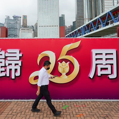 Twenty-five years since the handover of Hong Kong from the British back to China, journalist and former BBC Hong Kong correspondent Juliana Liu explores the cultural impact in Hong Kong itself and in the diaspora. Billy Tang is the new Executive Director and curator of Para Site, one of the oldest and most active independent art institutions in Asia. He tells us about the appeal of working in and shaping the culture of Hong Kong. Arts and culture journalist Vivienne Chow explores what’s happening in the Hong Kong cultural scene, from the revival of Cantopop, to the decision of some artists to leave the city. Samson Young is a Hong Kong based artist and composer with a fascination for sound and experimentation. He represented Hong Kong in the 2017 Venice Biennale and the energy, intensity and history of the city has influenced him and his work. He describes his latest project and what it’s like to make art in Hong Kong today. With the introduction of the National Security law and last year, the film censorship law, many artists have chosen to leave Hong Kong. Filmmakers Ka Leung Ng and Ching Wong first met making the dystopian speculative fiction film Ten Years, which won Best Film at the Hong Kong Film Awards in 2016.They’ve now come together again, and earlier this year created the first Hong Kong Film Festival UK. They explained why they felt it was important to show films that are no longer able to screen in their native Hong Kong. (Photo: A poster celebrating the 25th anniversary of Hong Kong's handover. Credit: China News Service/Getty Images)