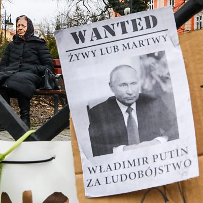 On Wednesday 23 March the US administration declared that Russian troops had committed war crimes in Ukraine. It claims to have evidence showing numerous deliberate attacks on civilians. An unprecedented number of countries have backed an investigation by the International Criminal Court into the allegations. The evidence is being gathered. Tanya Beckett explores whether it’s possible that Vladimir Putin will be held responsible and face trial for war crimes committed by his forces during this war. Producer: Louise Clarke-Rowbotham Researcher: Chris Blake (Banner reads 'Wanted Dead Or Alive Vladimir Putin For Genocide' in Przemysl, Poland. 5 March 2022. Credit: Beata Zawrzel /Getty Images)