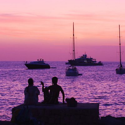 In June 1973, the nightclub Pacha opened in Ibiza. Other clubs with the capacity to fit thousands of people on the dancefloor opened in the years after, turning Ibiza into a destination for music and party lovers from around the world. Vicky Carter speaks to Carlos Martorell who organised Pacha’s opening party and Francis Van Orden, a Dutch hippy who danced all night on the opening night. (Photo: Sunset over the sea with boats in the distance. Credit: BBC and Minnow Films)