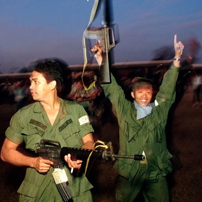 In 1986, four days of huge public protests brought down President Ferdinand Marcos of the Philippines. Kate McGowan, in Manila, talks to the leading Filipino novelist, Jose Dalisay, about the demonstrations. This edition of Witness History was first broadcast in 2011. PHOTO: Filipino troops celebrating the fall of President Marcos (Getty Images)