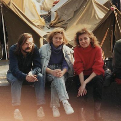 In 1990, Ukrainian students went on a hunger strike that helped bring down the Soviet regime there. It took place in Kyiv’s central square and inspired later protests against Russian influence in Ukraine: the 2004 Orange Revolution and the 2014 Maidan Revolution. The granite floor of the square provided its name: the ‘Revolution on Granite’. Ben Henderson spoke to Oksana Zabuzhko, an award-winning Ukrainian author, who participated in the protest when she was a recent university graduate. (Photo: Oksana Zabuzhko wearing a red jumper at the Revolution on Granite in 1990)