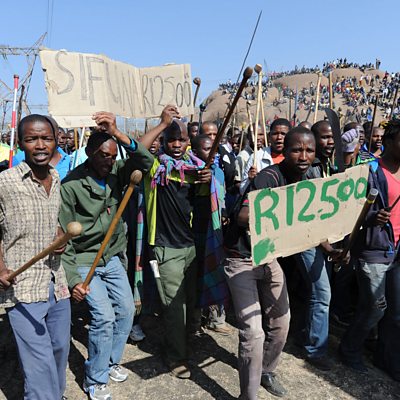 On 16 August 2012, police shot dead 34 striking miners at a platinum mine in Marikana, South Africa. It was one of the bloodiest police operations since apartheid. Rachel Naylor speaks to one of the survivors, Mzoxolo Magidiwana, who was shot nine times. (Photo: Miners on strike in Marikana, demanding a pay rise, on 16 August 2012. Credit: AFP/GettyImages)