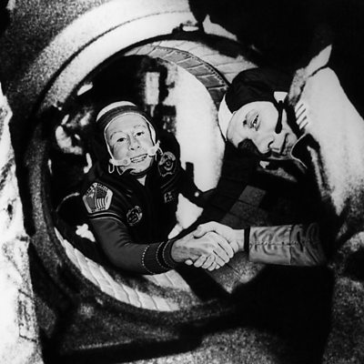 In 1975, Russian cosmonauts and American astronauts met up in space and shook hands. Millions watched on TV as the two spacecraft docked together and the door between the ships opened. The handshake between the two Cold War superpowers was hailed as a symbol of efforts towards peace and stability. Nick Holland tells the story with the help of former NASA chief historian, Bill Barry. (Photo The Handshake in Space. Credit: AFP/Getty Images)