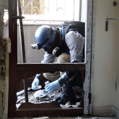 In 2013, more than a thousand people are thought to have died in a chemical weapons attack on a suburb of the Syrian capital Damascus called Ghouta. It was the single deadliest attack of the Syrian civil war and the UN later confirmed that the nerve agent Sarin had been used. Louise Hidalgo speaks to Angela Kane, the former UN High Representative for Disarmament Affairs. Her team of chemical weapons inspectors reached the site in Ghouta just days after the attack. PHOTO: A UN inspector at work in Ghouta in August 2013 (AFP/Getty Images)