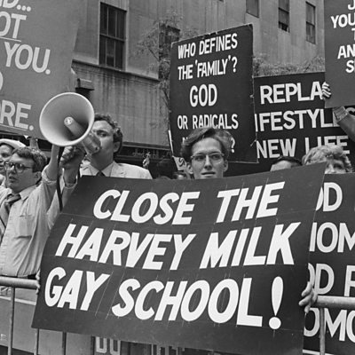 In 1985, a unique High School opened in New York to provide a safe environment for LGBT students needing specialised education. The publicly-funded Harvey Milk High School was founded by former social worker, Steve Askinazy. Initially, it faced some opposition from the media and Christian groups, but the school eventually expanded and currently takes about 60 students a year. Alex Collins talks to Steve Askinazy. PHOTO: A protest outside the Harvey Milk High School in 1985 (Getty Images)
