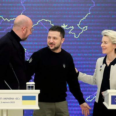 European Union leaders have been in Kyiv meeting Ukraine's President Zelensky, as he hopes to accelerate his country's bid to join the trading bloc. Meanwhile, the EU is to introduce a ban on petroleum products being imported from Russia. We hear from a former Ukrainian Economy minister and an economist. We get the latest from India as allegations of fraud against Indian billionaire Gautam Adani spill over into political row. And we find out about the latest craze in the UK for a Youtuber promoted energy drink. (Picture: Ukrainian President Volodymyr Zelensky, European Commission President Ursula von der Leyen and President of the European Council Charles Michel attend their meeting with media following the Ukraine - EU summit in Kyiv, Ukraine, 03 February 2023. Credit: SERGEY DOLZHENKO/EPA-EFE/REX/Shutterstock)