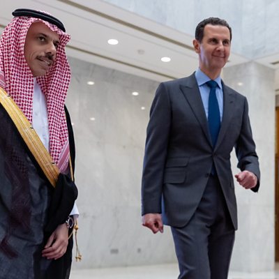 This week a meeting of Arab foreign ministers - including Syria's - took place in Jordan's capital, Amman. Officials have been discussing Syria's potential return to the Arab League, after 12 years of civil war. Hundreds of thousands of Syrians are dead, millions are refugees abroad, and a political settlement to the conflict remains elusive. But some of Syria’s neighbours are now keen to build closer relations with the Syrian regime. A tentative normalisation of relations with President Assad has been years in the making. So what is driving it? What might a change in international relations mean for ordinary Syrians? And what does this diplomacy reveal about politics and power in the region? Shaun Ley is joined by a panel of expert guests: Rime Allaf - a Syrian-born writer and a former fellow at the Chatham House international affairs think tank in London. She is also a Board Member of the Syrian civil society organization The Day After Steven Simon - served on the US National Security Council in the Obama administration as senior director for Middle Eastern Affairs from 2011 to 2012. He's now a Fellow at the Massachusetts Institute of Technology and author of “Grand Delusion: The Rise and Fall of American Ambition in the Middle East” Ismaeel Naar - Arab Affairs Editor for The National, a newspaper owned by the deputy prime minister of the United Arab Emirates who is also a member of the royal family of Abu Dhabi. Also featuring: Jawad Anani, an economist and Jordan's former foreign minister and deputy prime minister Joel Rayburn, President Trump's special Envoy for Syria from 2018 to 2021 Photo: Faisal bin Farhan Al Saud, Minister of Foreign Affairs of Saudi Arabia meets Bashar al-Assad on April 18, 2023 in Damascus, Syria. (Credit: Saudi Arabian Foreign Ministry/Handout/Anadolu Agency via Getty Images)