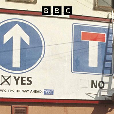 On 22 May 1998, a referendum was held in Northern Ireland and the Republic of Ireland asking voters if they supported the Good Friday Agreement. In both, the majority of the electorate voted in favour of adopting the peace deal. Rachel Naylor speaks to Jane Morrice, from the Yes campaign, and Lee Reynolds, from the No campaign. (Photo: A poster in Belfast ahead of the referendum. Credit: Gerry Penny via Getty Images)