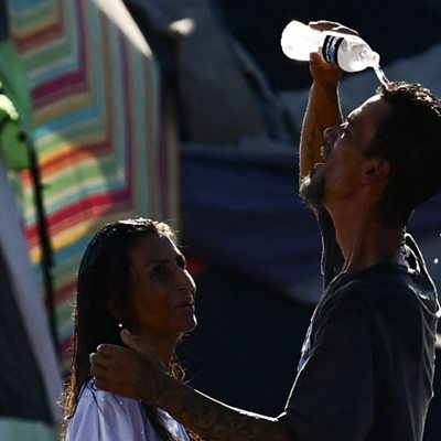 Businesses in South-West of the United States explain how the weather is impacting them. ‘Flying taxis’ could be become a reality in some cities as soon as 2026. And, we discuss Burberry, the 170 year old high-fashion brand built on its British principles. (Roni and John pour water on themselves to cool off from extreme heat while residing in "The Zone," a vast homeless encampment where hundreds of people reside, during a record heat wave in Phoenix, Arizona, on July 19, 2023. Source: Getty Images)