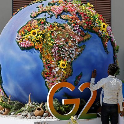 Officials at the G20 summit in Delhi say the African Union could become a member. The proposal has been backed by the US and by India, which is hosting the meeting. (Workers decorate a G20 installation at the International Media Centre (IMC) on the eve of the two-day G20 summit in New Delhi on September 8, 2023. Picture Credit: Getty Images)