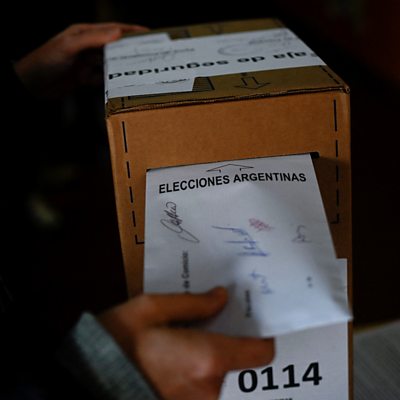 Voters in Argentina will be heading to the voting centres on Sunday to cast their ballot in what is widely regarded as the most unpredictable presidential election since the country returned to democracy 40 years ago. And this comes in the middle of an economic crisis with inflation is at almost 140%. One of the Presidential candidates, Javier Milei is promising to dollarizing the economy and get rid of the local currency, the Peso. (A woman casts her vote during primary elections at a polling station in Tigre, Argentina, on August 13, 2023. Photo Credit: LUIS ROBAYO/AFP via Getty Images)