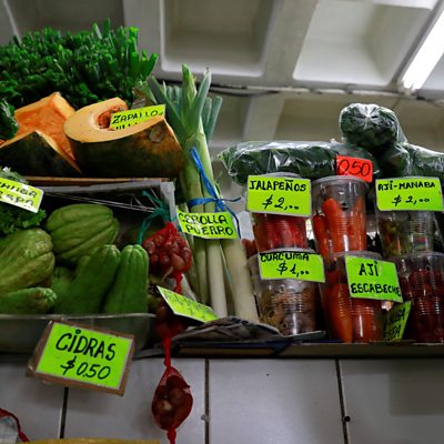 How is the crisis in Ecuador affecting the country's economics - can it maintain the exports that provide most of its income? Roger Hearing will be taking a look at this. There are moves being made by UK politicians to take action against Fujitsu, the company that made the faulty software that led to the false convictions of hundreds of post office managers. And the dog ate my money - we hear from the US official who can rebuild chewed banknotes. (Picture Image: Fresh produce with tags showing the prices in Ecuador's legal tender the U.S. dollar, in Quito. Credit: Reuters)