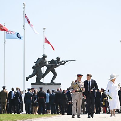 John Simpson, in discussion with the BBC's unparalleled range of experts across the world, examines the new threats to peace and security on the 80th anniversary of the D-Day campaign to liberate Western Europe, asks why the African National Congress Party has failed to win a majority in the South African parliament after 30 years in power, and considers why immigration is a key issue in elections this year in many countries. (Photo: King Charles III, President of France Emmanual Macron, Queen Camilla and Brigitte Macron ahead of the UK national commemorative event for the 80th anniversary of D-Day, held at the British Normandy Memorial in Ver-sur-Mer, Normandy, France. Picture date: Thursday June 6, 2024. PA Photo. See PA story MEMORIAL DDay. Eddie Mulholland/The Telegraph/PA Wire)