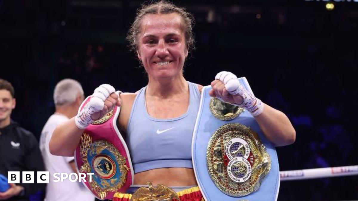 Ellie Scotney celebrates after unifying the super-bantamweight divisionImage source, Getty Images