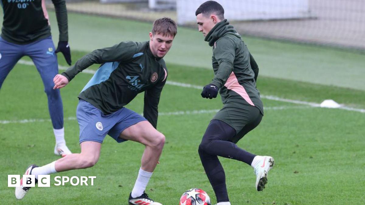 Jacob Wright takes on Phil Foden in a Manchester City training session last week