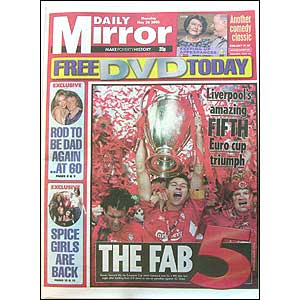 ![]() | 'Footballing miracle' Liverpool's inspirational captain Steven Gerrard holds aloft the European Cup - the club's fifth - on the front page of the Daily Mirror. "It felt as if some supernatural force had decreed that Liverpool should win," says the Mirror's Oliver Holt. |