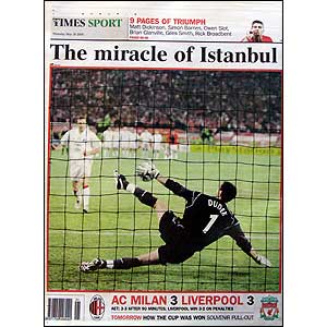 ![]() | 'Astonishing' "Liverpool celebrated their fifth European Cup all the more joyously because of the astonishing manner of victory," says the Times. Its back page shows the moment when Jerzy Dudek's penalty save clinched the cup. |